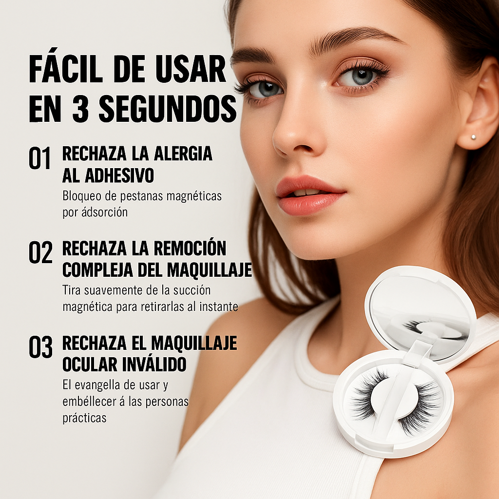 Mirada impactante en segundos, gracias a su tecnología magnética avanzada que elimina el uso de pegamento y evita irritaciones.