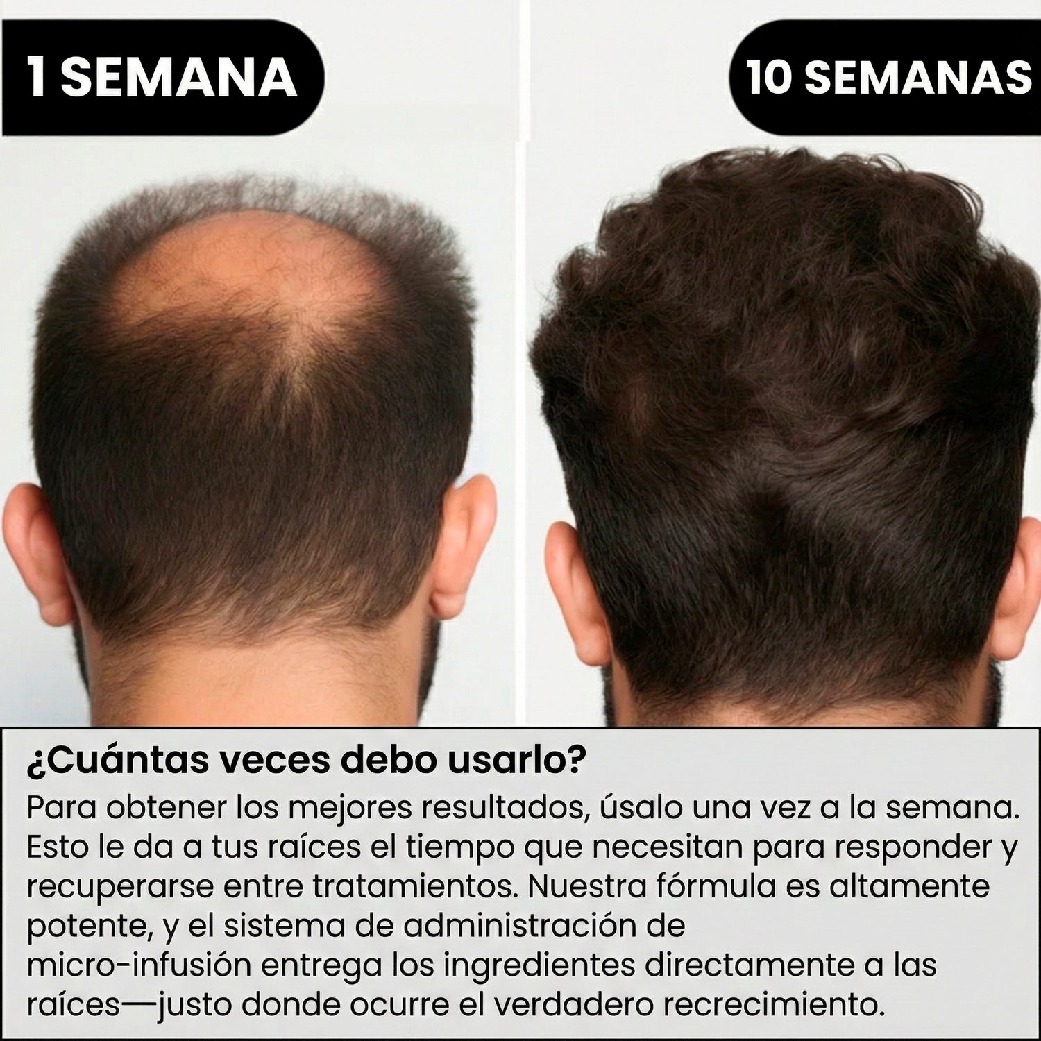 Aplica AlphaInfuse™ una vez por semana para resultados notables. 🌿 Nuestra fórmula avanzada y la tecnología de micro-infusión 💧 actúan directamente sobre las raíces, estimulando el crecimiento de nuevos brotes 🌱 y fortaleciendo el cabello existente. ¡Recupera la densidad y volumen de tu cabello de manera natural y eficaz! 💪